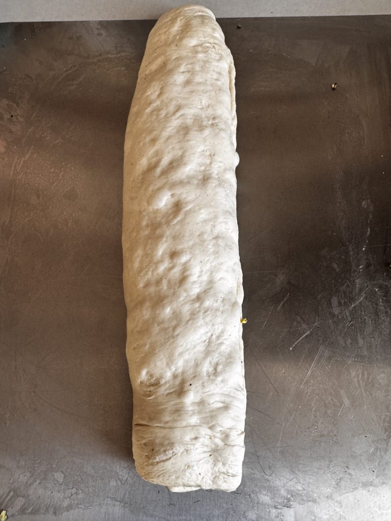 Com uma faca de pão ou um cortador MUITO afiado, dividir ao longo do comprimento a massa, deixando a parte de cima unida.
