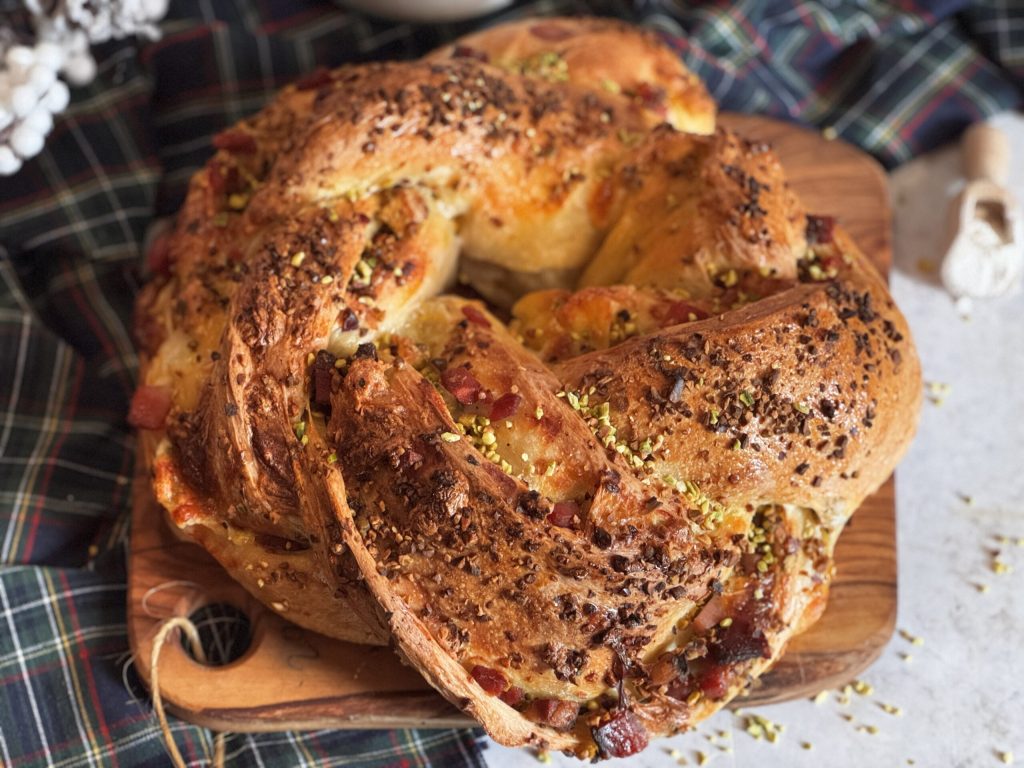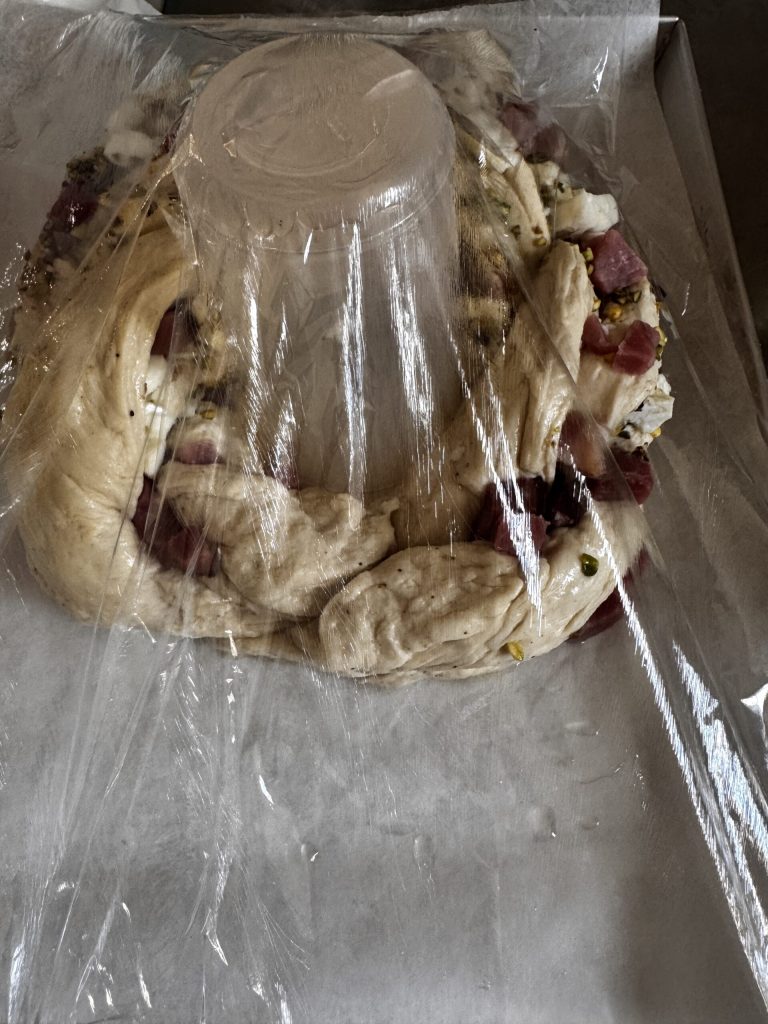 Transferir delicadamente a trança para uma assadeira forrada com papel manteiga e colocá-la em forma de guirlanda, fechando as extremidades.