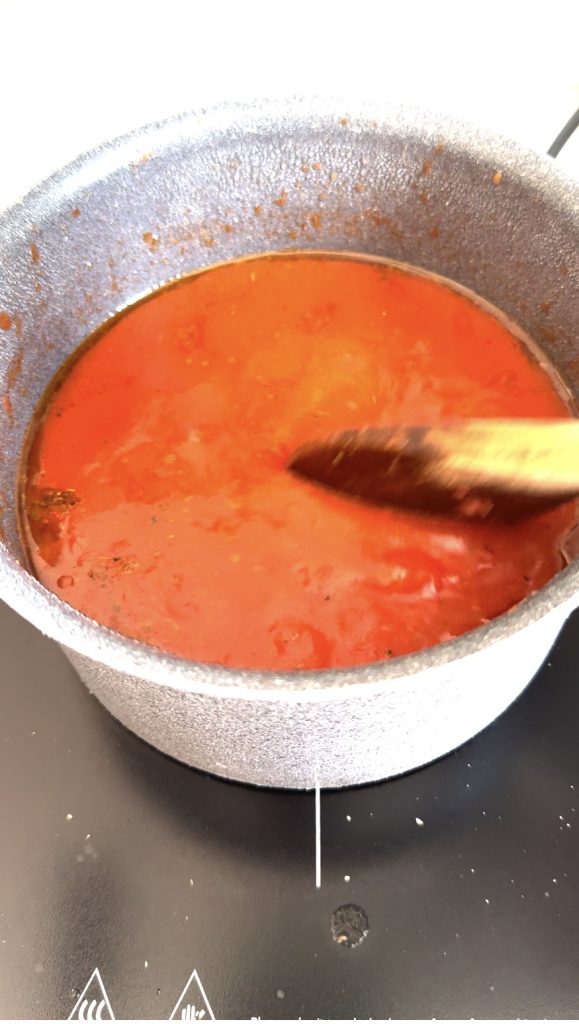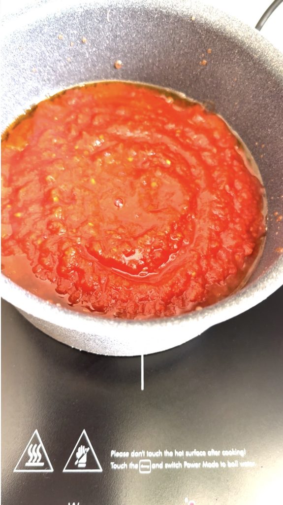 Agora, coloque a polpa de tomate na panela e tampe. Cozinhe em fogo baixo, mexendo de vez em quando. Você pode decidir se remove o dente de alho logo ou deixar cozinhando pra intensificar o sabor.