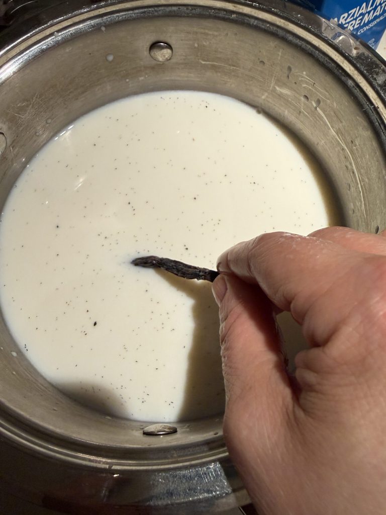 Na noite anterior, coloque para ferver 1 litro de leite (eu uso o parcialmente desnatado) com uma pitada de sal e a vagem de baunilha aberta.
