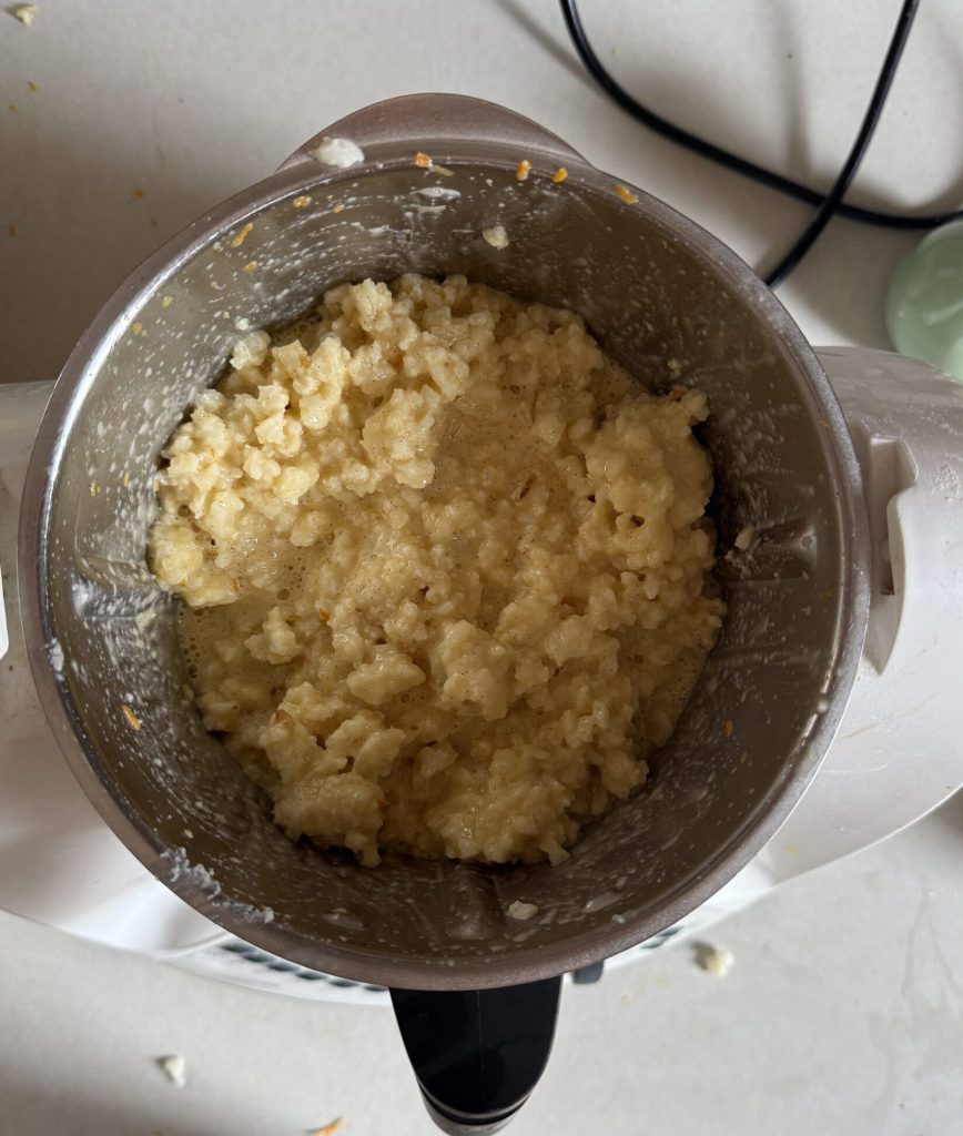 No processador, triture o arroz junto com os outros ingredientes até obter uma mistura homogênea. Este é o passo delicado: quanto mais triturar, mais cremosos ficarão os bolinhos; quanto menos triturar, mais os grãos permanecerão inteiros e com textura. No Bimby eu triturei na velocidade 5 por 1 minuto.