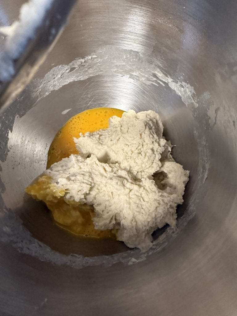 Despedace o fermento natural na batedeira planetária e adicione 120 g de líquidos previamente misturados e o açúcar.