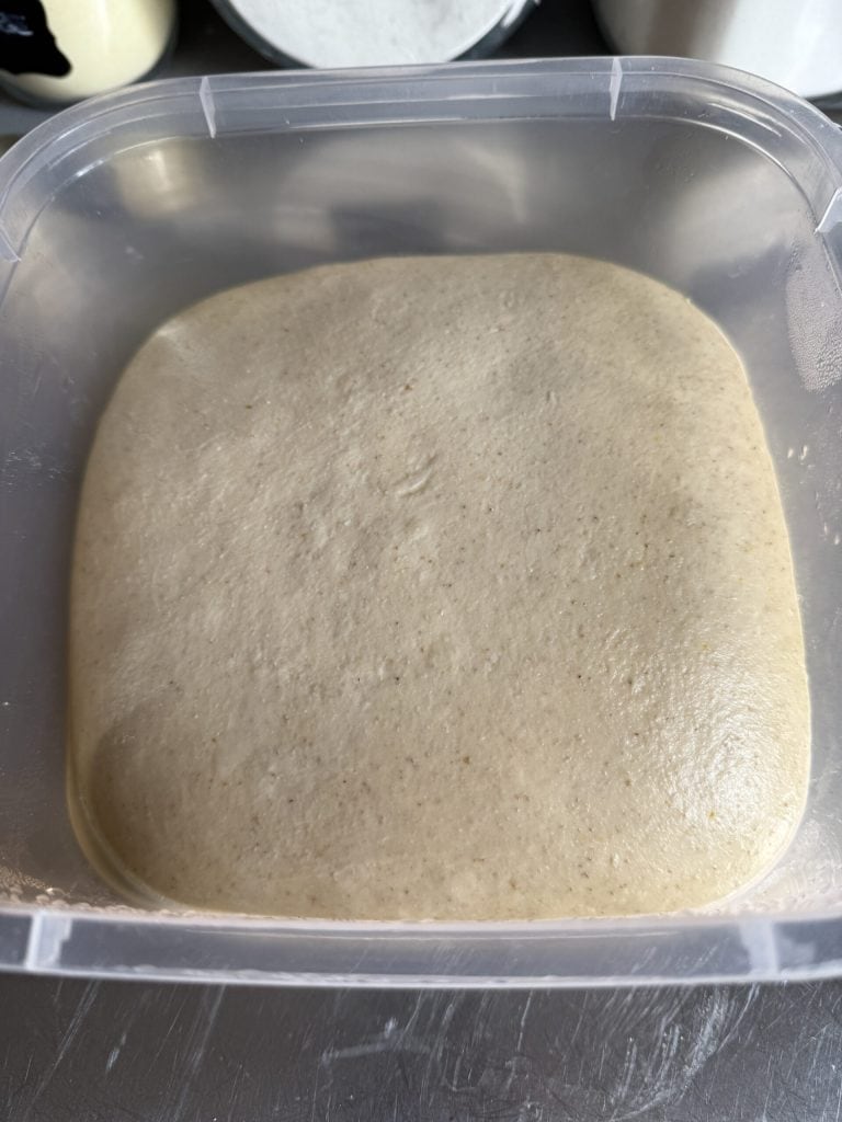 Depois de sovado, faça três dobras ‘slap and fold’ na superfície de trabalho a cada 15 minutos e depois coloque em um recipiente fechado. Coloque na geladeira durante a noite.