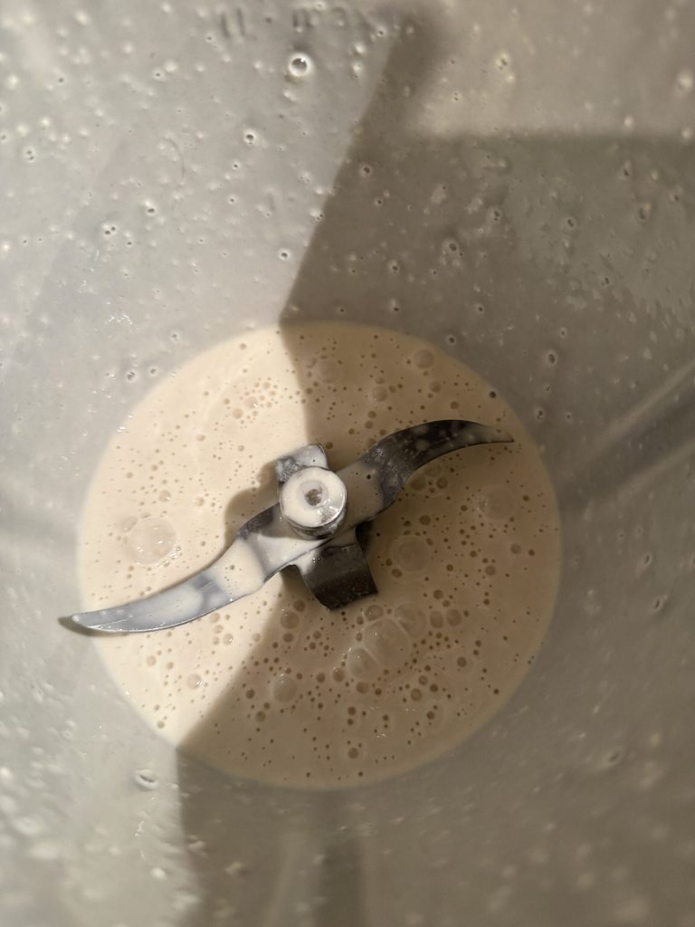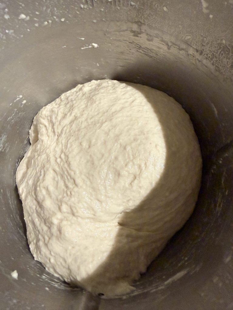 Adicione ao Bimby a massa autolítica preparada anteriormente e sove em modo ‘spiga’ por cerca de 4-5 minutos, até obter uma massa homogênea. Para evitar aquecimento excessivo, recomendo fazer pausas a cada três minutos, talvez soltando a massa das lâminas.