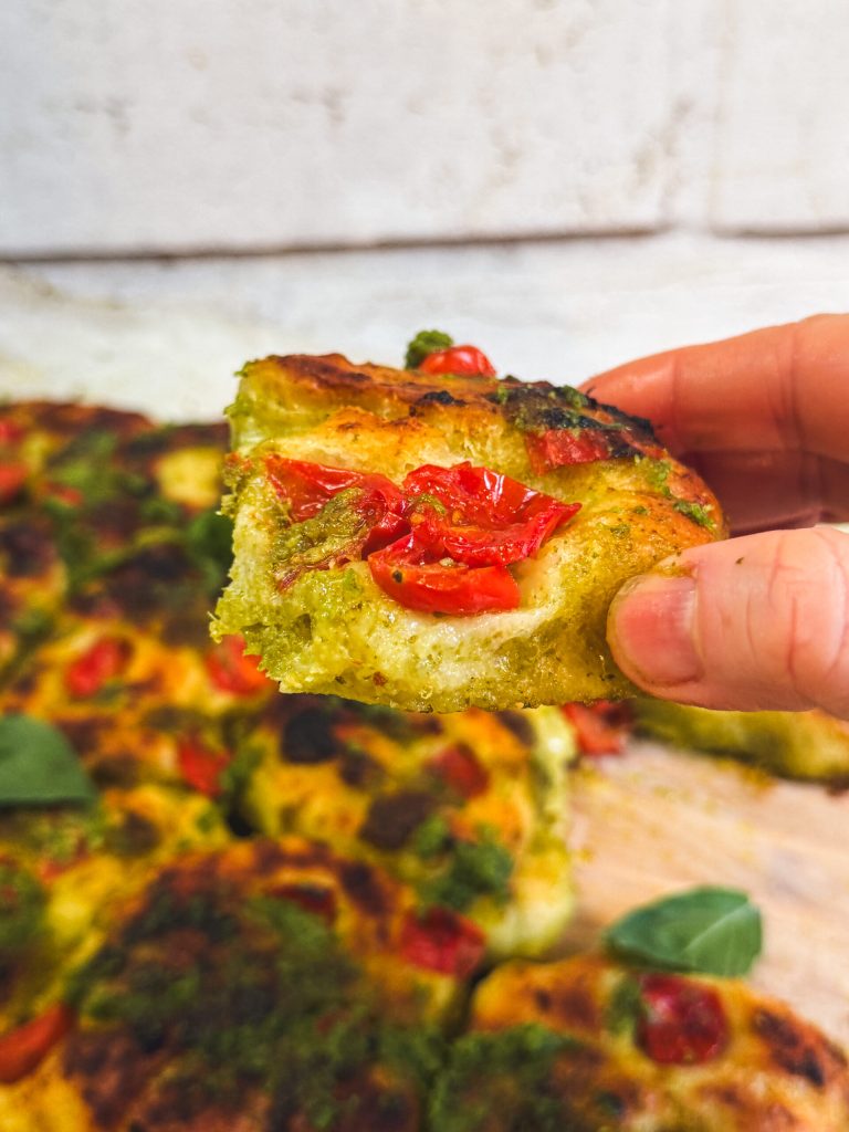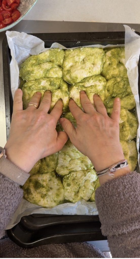 A focaccia pull apart com pesto e tomatinhos é convivial, perfumada e perfeita para uma noite entre amigos. Inspirada no famoso pull apart bread americano, esta focaccia é porcionada destacando as bolinhas uma a uma, e existem versões tanto doces quanto salgadas. A minha recria a receita aproximando-a de sabores mais italianos, com pesto fresco, tomatinhos suculentos e uma polvilhada de pecorino romano, para um resultado irresistível e perfeito para compartilhar.