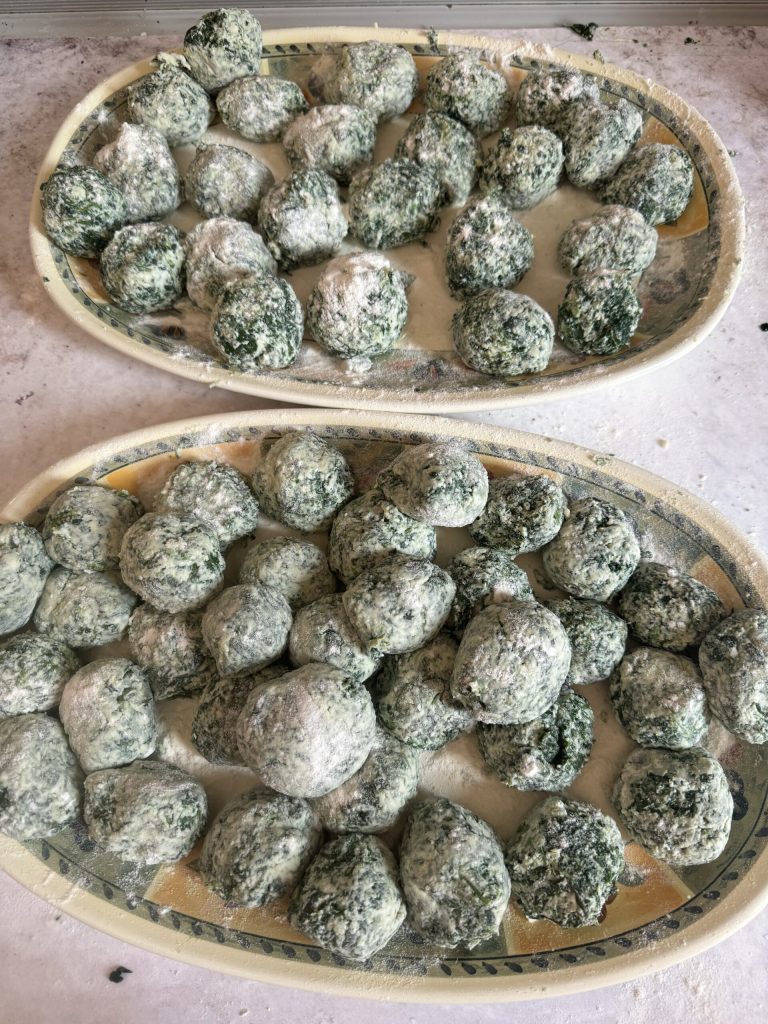 À medida que se formam as bolinhas, colocá-las nas bandejas à disposição e, se necessário, polvilhar com um pouco de farinha. Os gnudi toscanos também podem ser feitos com duas colheres, formando quenelles, mas este é o método “rústico” que sempre foi usado em minha casa.