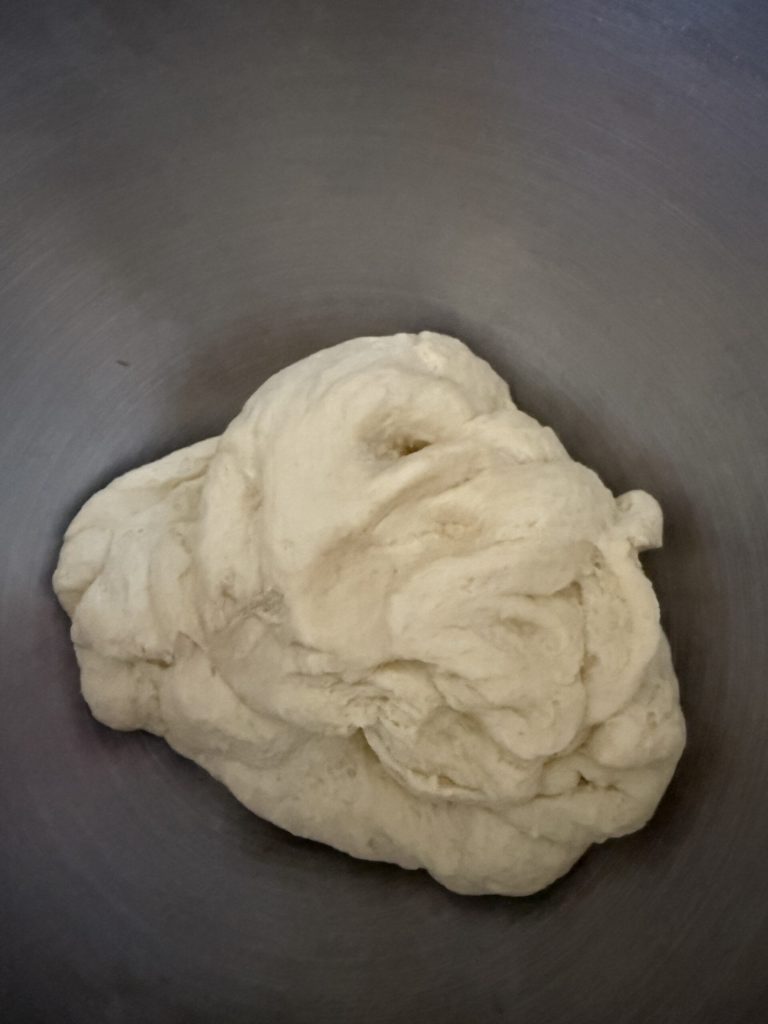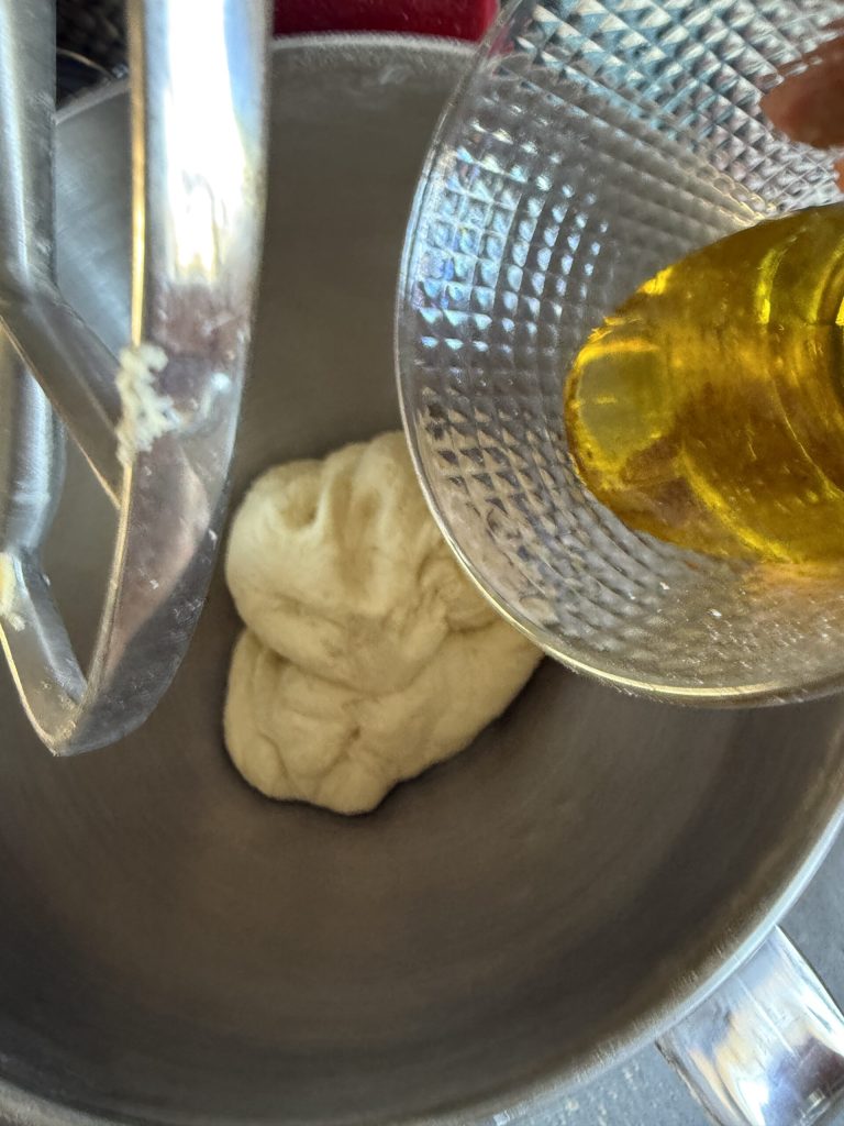 Dividi a adição em três etapas, para permitir que a massa se desenvolva sem ficar muito pesada ou seca. Não tenha pressa: deixe que a batedeira trabalhe lentamente e absorva bem cada adição antes de adicionar a próxima.Quando você tiver adicionado toda a farinha e toda a água, aumente um pouco a velocidade e deixe a massa se desenvolver. As laterais da batedeira devem ficar limpas. Você obterá uma massa macia e bem ligada, pronta para o azeite.