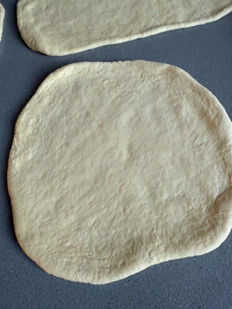 Pegue uma porção de massa de cada vez e forme uma bolinha lisa enrolando as porções na superfície um par de vezes. Com a ajuda de um rolo de massa, comece a estendê-la delicadamente sobre uma superfície enfarinhada.