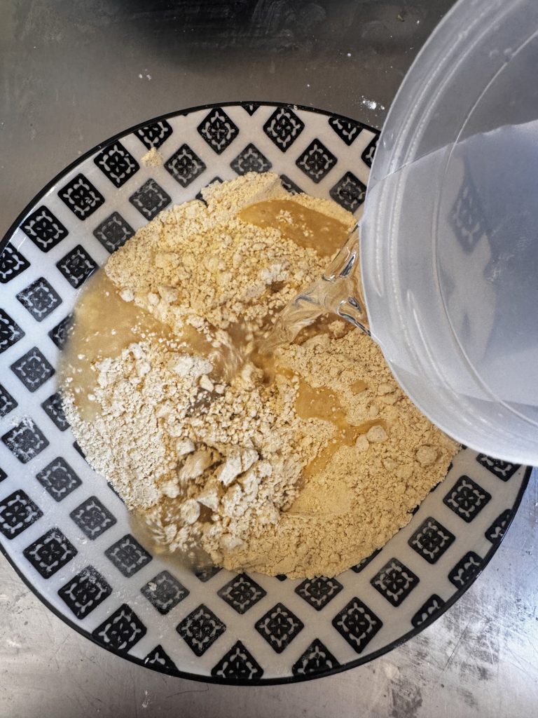 Despeje a primeira pequena parte da água e misture com o garfo. A massa estará muito grossa neste momento.