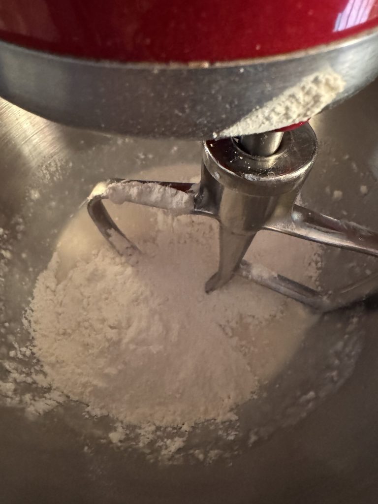 Adicione neste ponto o water roux bem frio e misture bem.Depois de peneirar e misturar as farinhas, adicione-as aos poucos alternando com o leite de amêndoa. Antes de prosseguir com as adições, espere que os líquidos anteriores sejam absorvidos. Retire o batedor de pá e coloque o gancho.