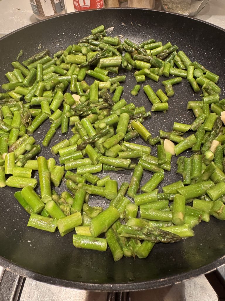 Adicione os aspargos resfriados (se não gostar, pode retirar o alho com o qual foram cozidos).