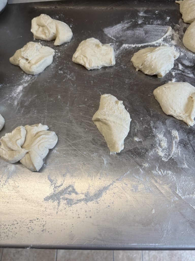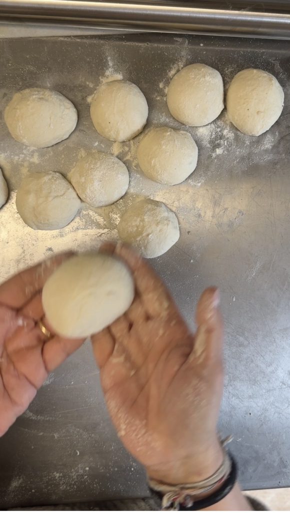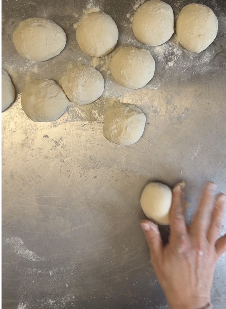 Pegue cada porção de massa e dobre sobre si mesma para formar bolinhas, depois enrole-as delicadamente. Eu recomendo prepará-las todas antes e depois enrolá-las novamente, começando pela primeira que foi feita: isso ajuda a dar maior tensão e coesão às bolinhas, tornando-as mais fáceis de abrir e mais compactas ao assar.