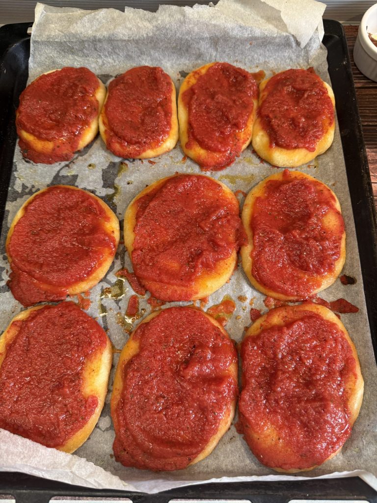 Um dos motivos pelos quais essas pizzinhas vermelhas macias sem fermento são tão deliciosas é a dupla cocção. Para começar, espalhe metade do molho preparado anteriormente sobre as bases, distribuindo uniformemente sem exagerar.