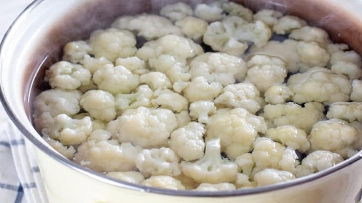 Limpamos e cortamos em pedaços as batatas e a couve-flor. Colocamos juntos em uma panela com água onde vão ferver até ficarem bem macios.