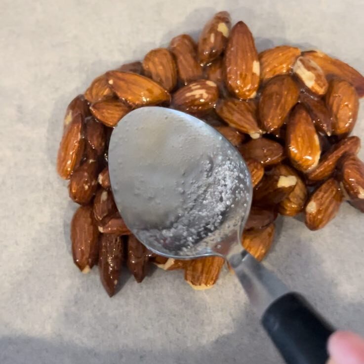 Você pode usar o método de tostagem que preferir. Eu torrei no micro-ondas. Em uma assadeira, coloquei as amêndoas todas separadas umas das outras e pulverizei com azeite de oliva extra virgem. Depois, coloquei no forno de micro-ondas na temperatura máxima por 1 minuto. Em seguida, retirei do forno, deixei esfriar um pouco e repeti o processo mais 2 vezes.