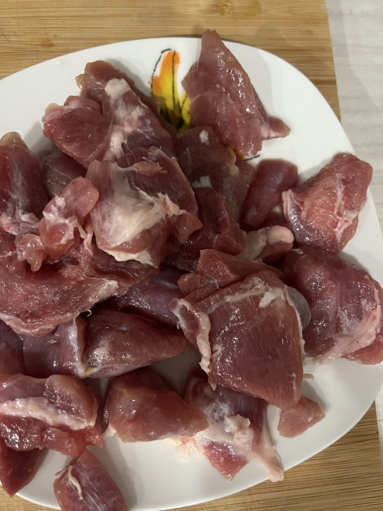 1. Corte os cubos de carne em pedaços pequenos, de acordo com o tamanho que preferir, e retire o excesso de gordura com a ajuda de uma faca. Recomendo que faça cubinhos de 2 centímetros cada, isso acelerará o cozimento.