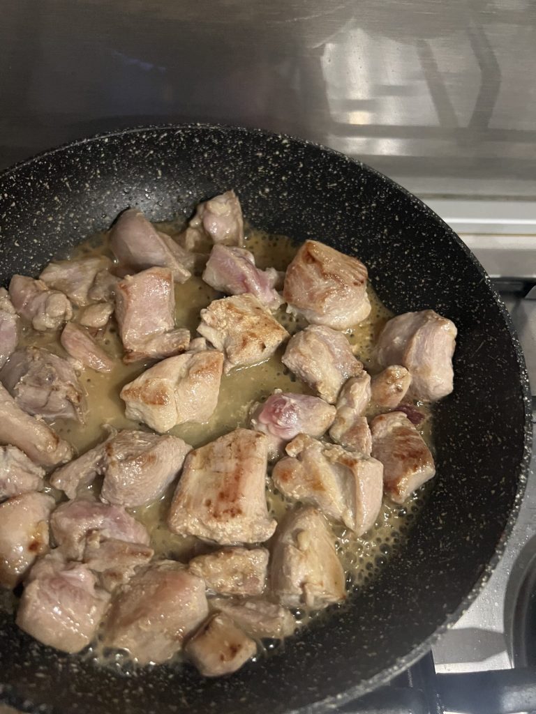 3. Adicione quase imediatamente os cubos de carne e deixe selar bem, dourando-os com a pitada de sal e pimenta.