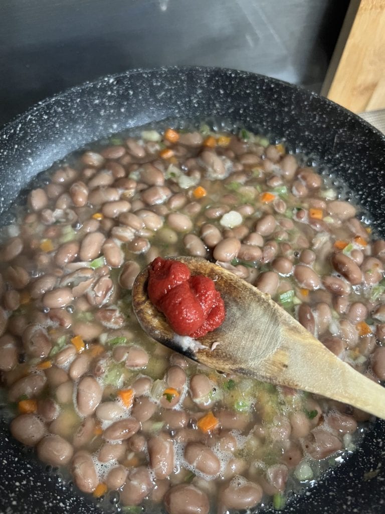 Na panela, douramos um fio de azeite com a cebola picada, o alho picado, a pimenta e as especiarias (páprica e coentro). Agora adicionamos o feijão e deixamos absorver o sabor por dois minutos antes de adicionar meio copo de água quente e o extrato de tomate.