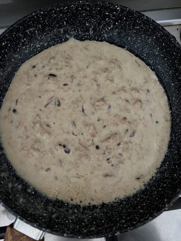 Assim que estiver ligeiramente murcho, podemos adicionar o creme de leite. Se o creme estiver muito denso, adicione uma concha da água do cozimento. Deixe cozinhar tudo por alguns minutos.
