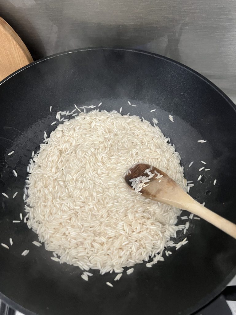Enquanto isso, na wok começamos a tostar o arroz. Então, em fogo alto, mexemos o arroz até que se torne ligeiramente transparente. Nesse ponto, adicionamos o vinho e deixamos evaporar, sempre mexendo de vez em quando.