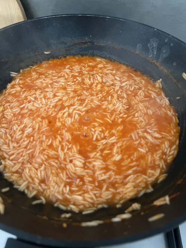 Uma vez que o vinho tenha evaporado, baixamos um pouco o fogo e começamos a adicionar o caldo. Conforme o arroz o absorve, adicionamos mais. Quando chegar na metade do cozimento, adicionamos conchas do molho de tomate cozido.