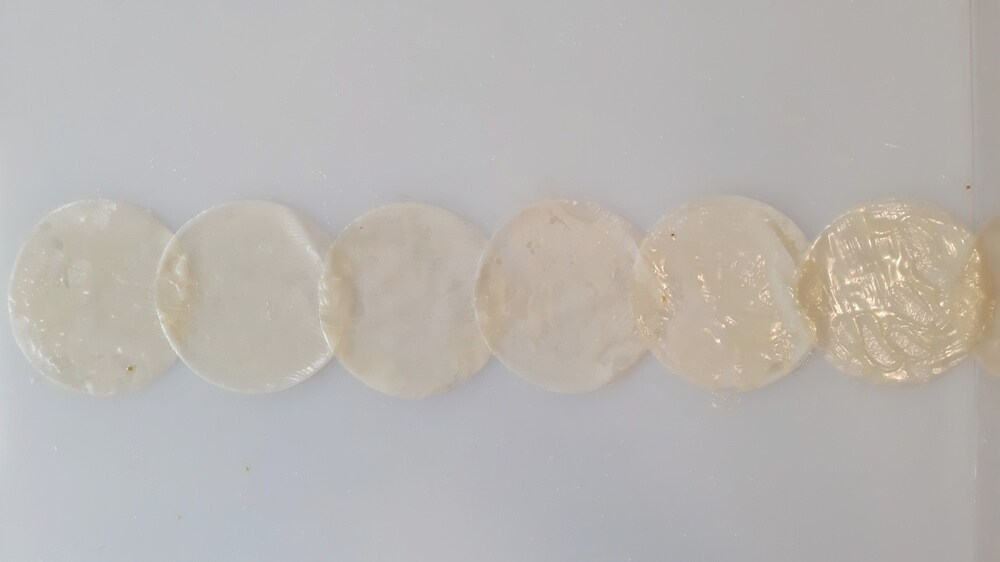 Abra a massa filo e coloque-a na bancada, com um cortador de massa de 8 cm recorte discos; coloque-os em um prato, mantendo-os cobertos com filme plástico, caso contrário, tendem a secar muito rapidamente.