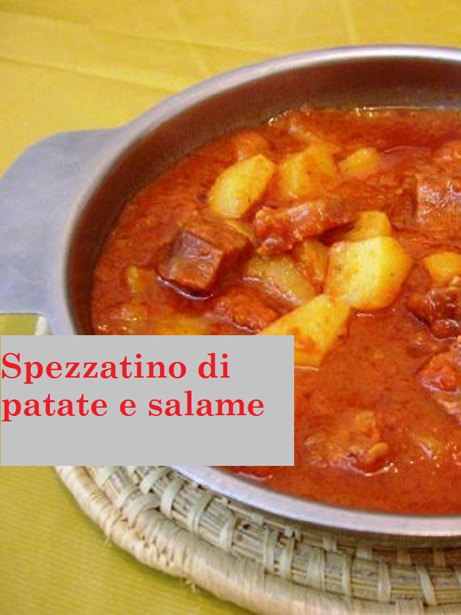 O ensopado de batata e salame é uma receita com um aroma inebriante e um sabor irresistível. É difícil se controlar quando você tem à mesa um bom salame caseiro para mergulhar no delicioso molho. É uma receita que pode ser preparada para o jantar, muito indicada para as estações de outono/inverno quando se precisa comer algo quente e também calórico. Escolher o salame certo é fundamental para o sucesso da receita, e por isso é aconselhável comprar um de boa qualidade. Basta ler as informações nas embalagens ou confiar na publicidade. 🙂 Você perceberá a qualidade quando ele não for muito gorduroso e, ao cortá-lo, permanecer compacto e não tiver um aspecto borrachento. Pode ser preparado como segundo prato e também como jantar, e é uma receita que pode agradar até mesmo as crianças com pouco apetite. O importante é não abusar dos embutidos que, de vez em quando, em quantidade moderada, estimulam o apetite.