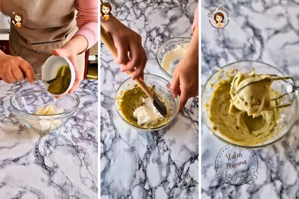 Em uma tigela, misture o mascarpone com o açúcar de confeiteiro e o creme de pistache.