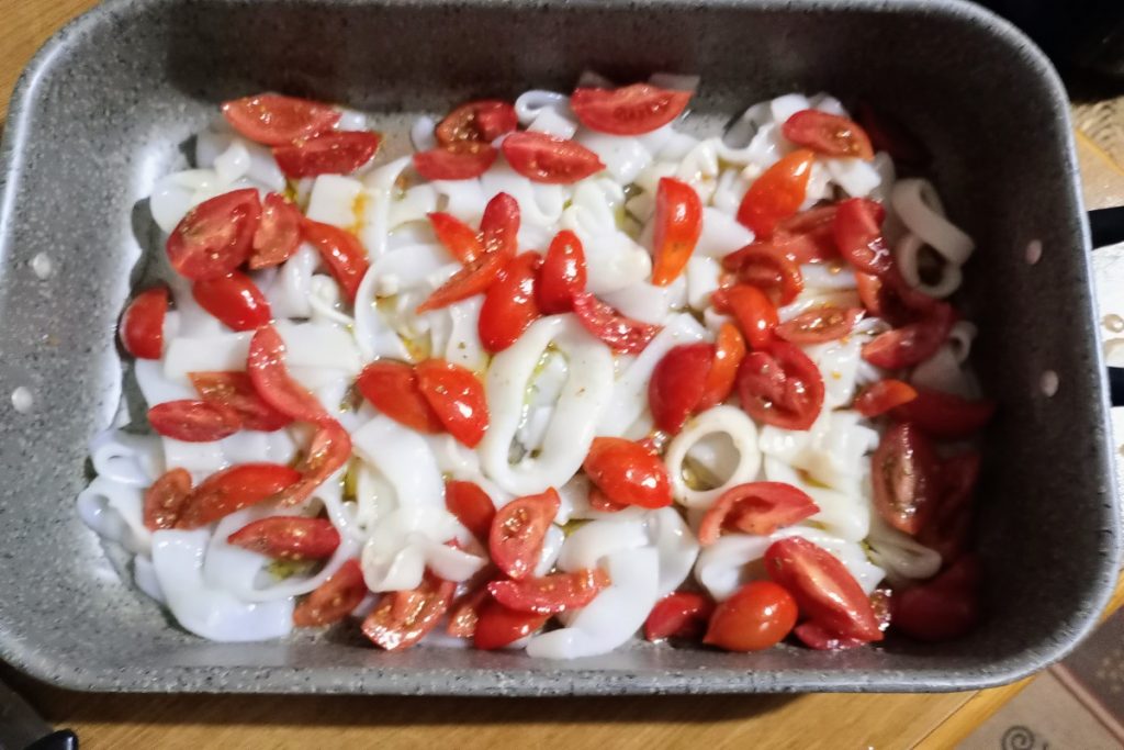 A receita ideal para o verão, mas é boa em qualquer estação, os anéis de lula ao forno com cebola roxa, tomatinhos e azeitonas não vão decepcioná-los!