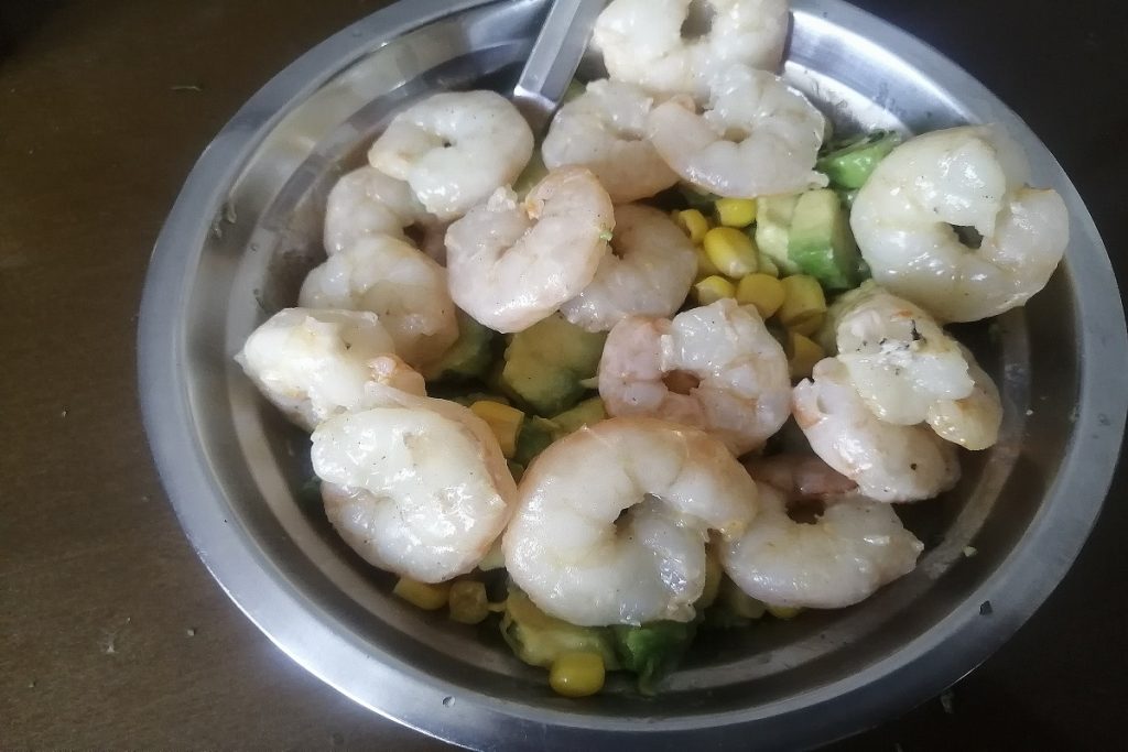 Quando os camarões estiverem cozidos, adicionamos ao resto dos ingredientes e misturamos.