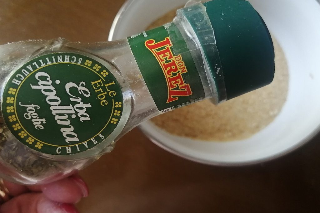 • Em uma tigela, colocamos a farinha de rosca e adicionamos as especiarias: cebolinha, tomilho e manjerona, misturamos.