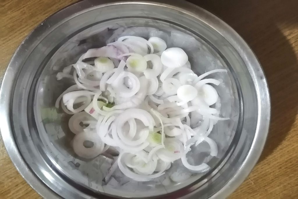 Fatie a cebola de Tropea, tentando separar o máximo possível os anéis.