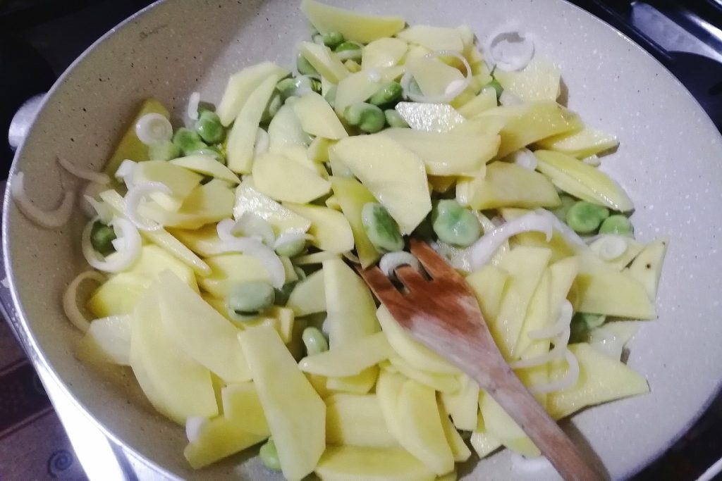 Em uma frigideira, coloque o azeite EVO e adicione as batatas, depois acrescente os outros ingredientes: cebola e favas.