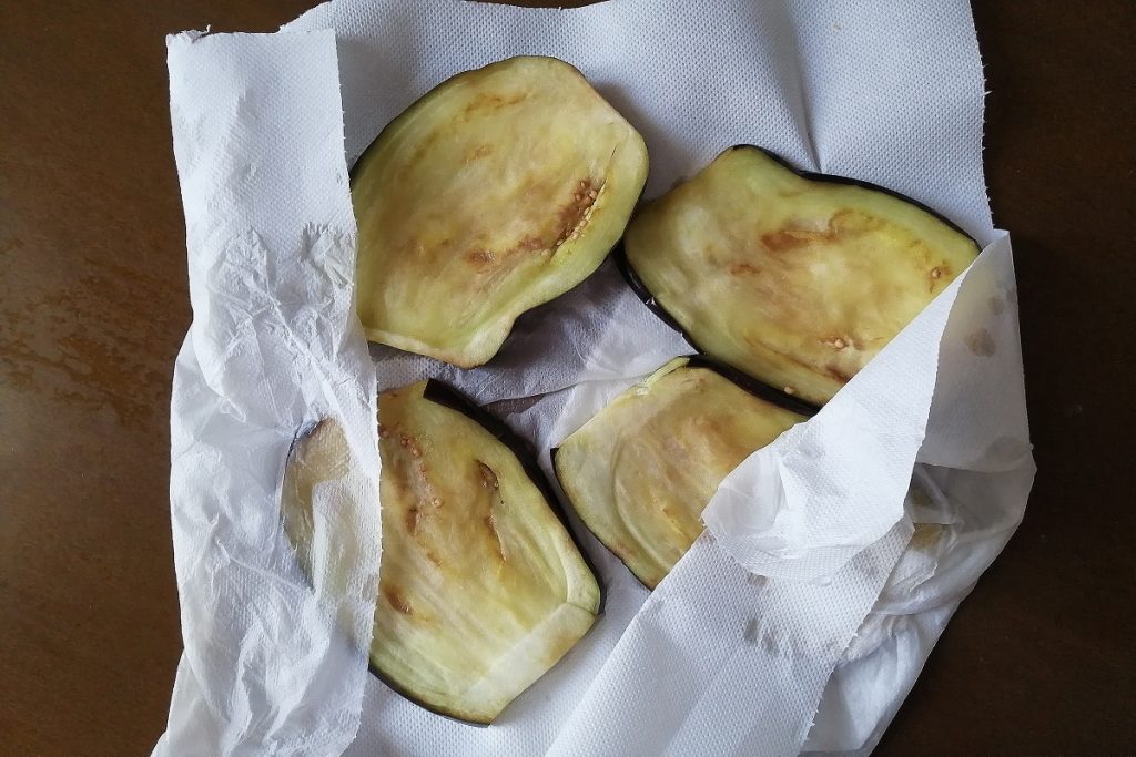 Após o tempo de descanso, esprememos as fatias e as secamos com papel toalha.