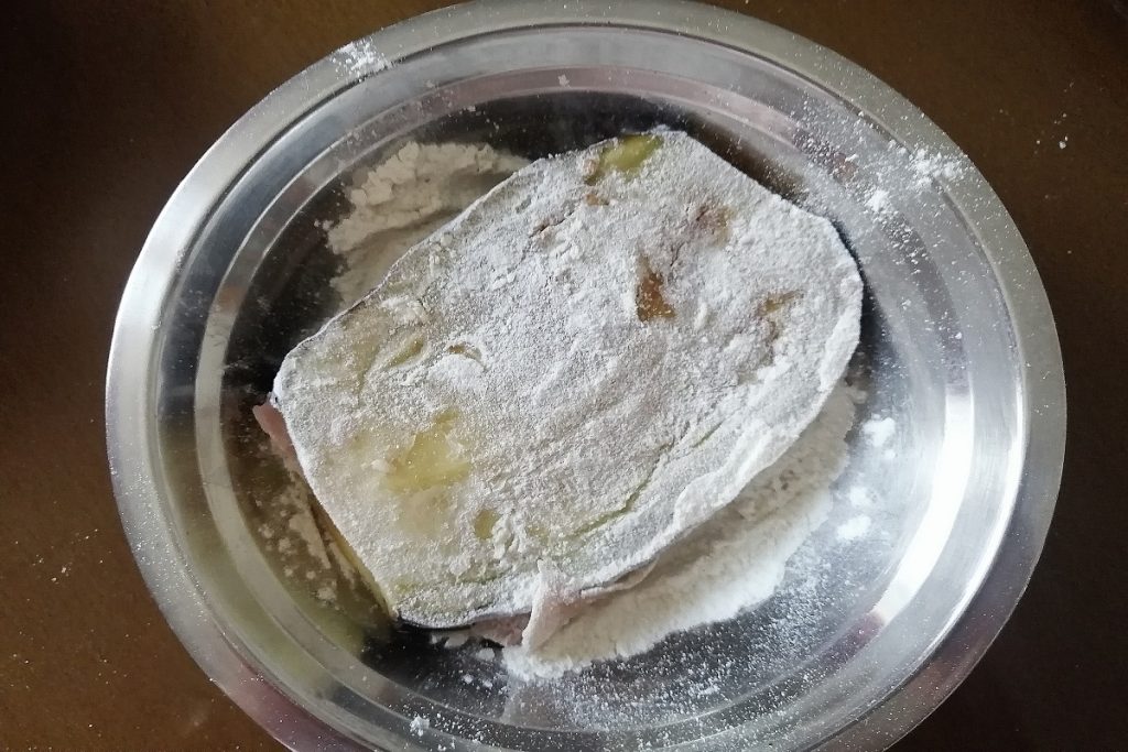 Passamos os bifes de berinjela na farinha, depois no ovo batido com uma pitada de sal e, por último, na farinha de rosca.