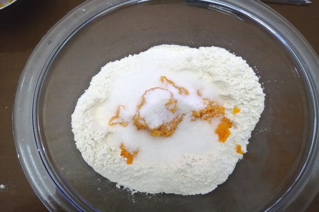 Em uma tigela, colocamos a farinha misturada com o fermento, a polpa de abóbora.