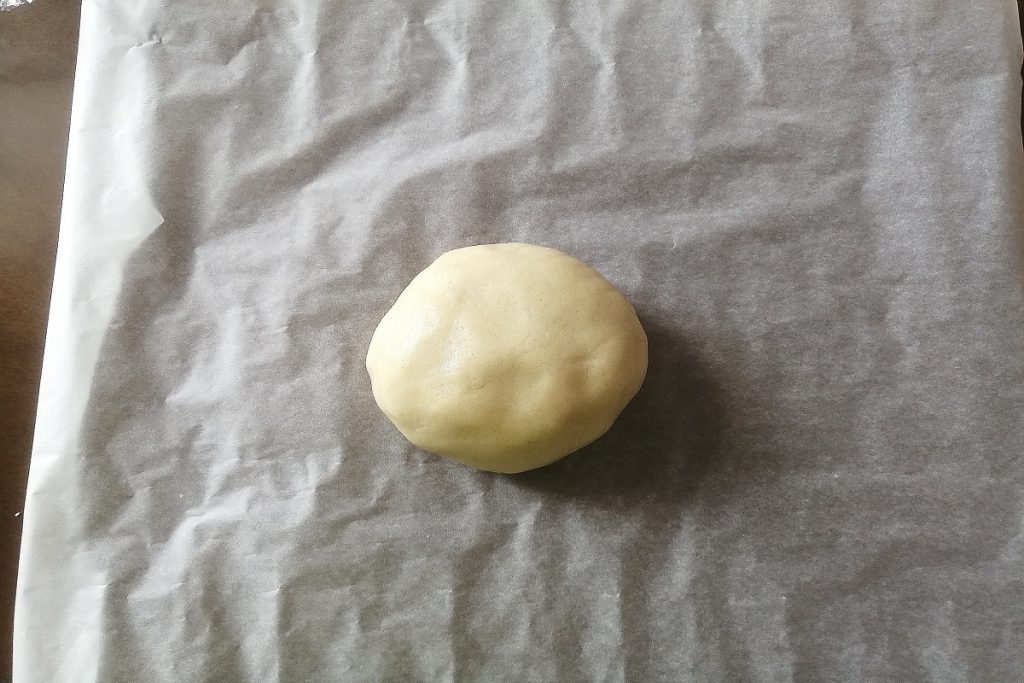 Coloque a massa sobre uma folha de papel vegetal e com um rolo abra a massa em uma camada fina de poucos milímetros.