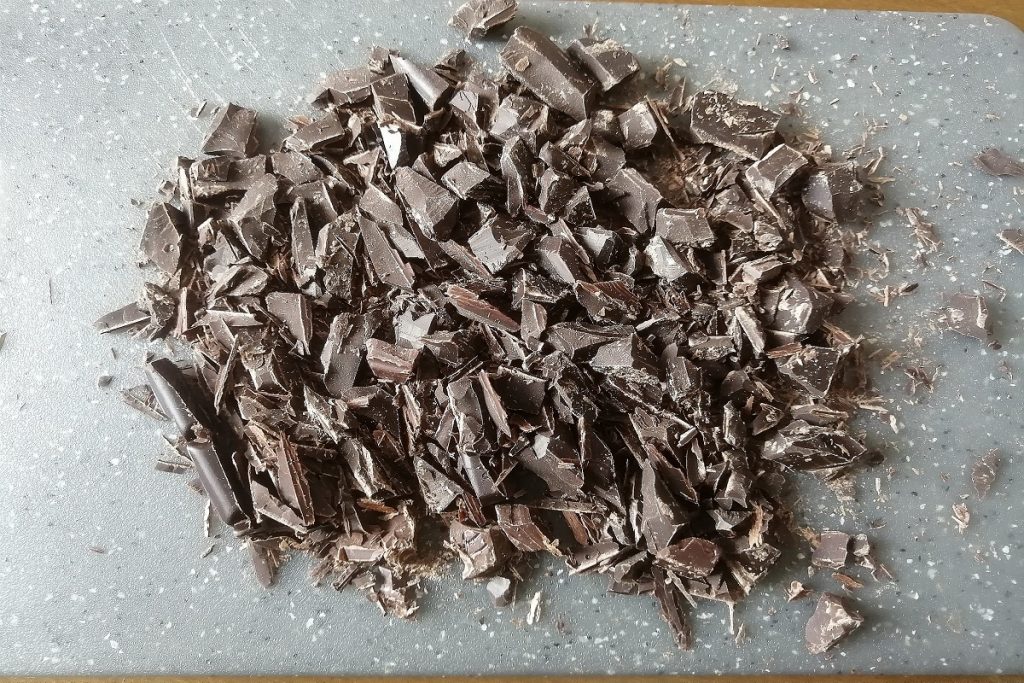 • Prepare a cobertura, cortando o chocolate em pequenos pedaços.