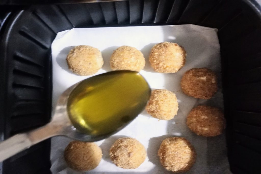 • Transfira os bolinhos para a cesta da fritadeira a ar e regue com 3 colheres de sopa de óleo EVO.