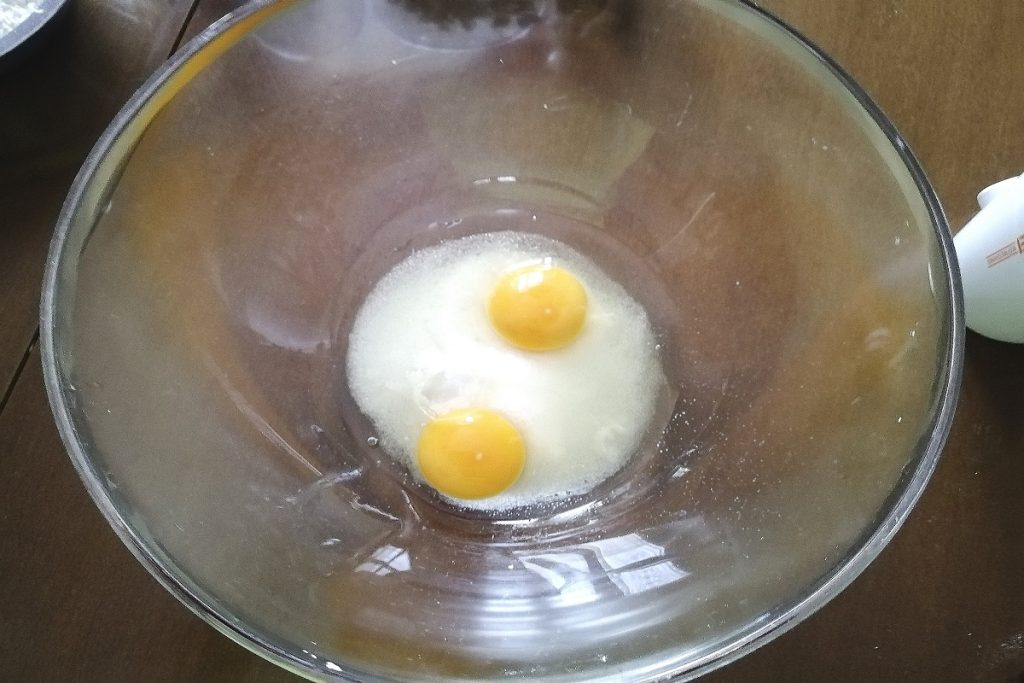 Em uma tigela, coloque o açúcar e os ovos, bata com a batedeira elétrica.