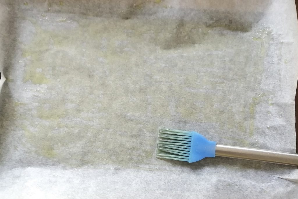 Forramos a assadeira com papel manteiga.