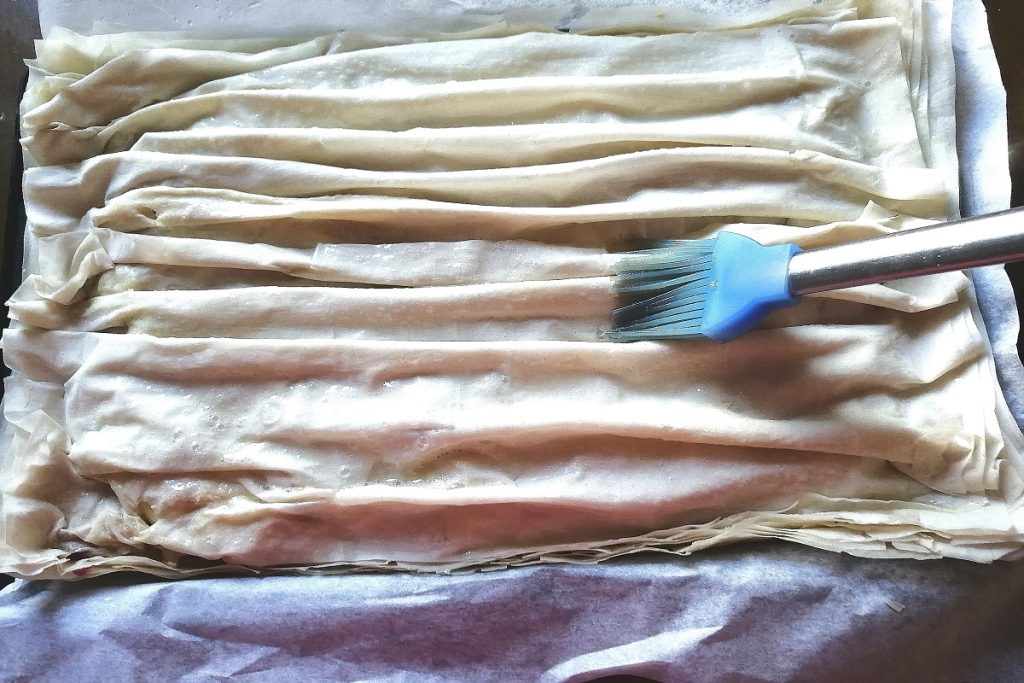 Começamos a formar a base com as folhas de massa filo, pincelando as camadas com óleo à medida que colocamos uma sobre a outra.
