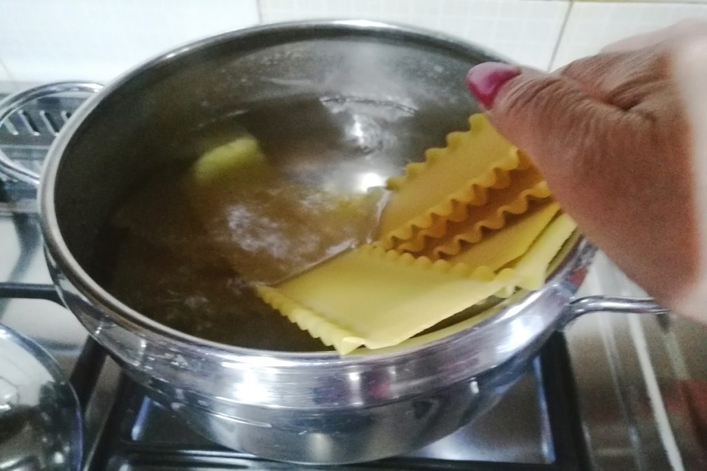 • Colocamos uma panela com água e sal, levamos ao fogo até ferver e mergulhamos as lasanhas.