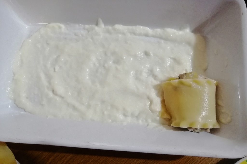 • Na assadeira de forno, adicionamos um pouco de molho bechamel no fundo e espalhamos com uma colher.