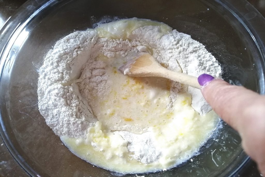 • Em uma tigela grande colocamos a farinha com o fermento, no meio colocamos o leite, a manteiga derretida, o ovo e o sal.