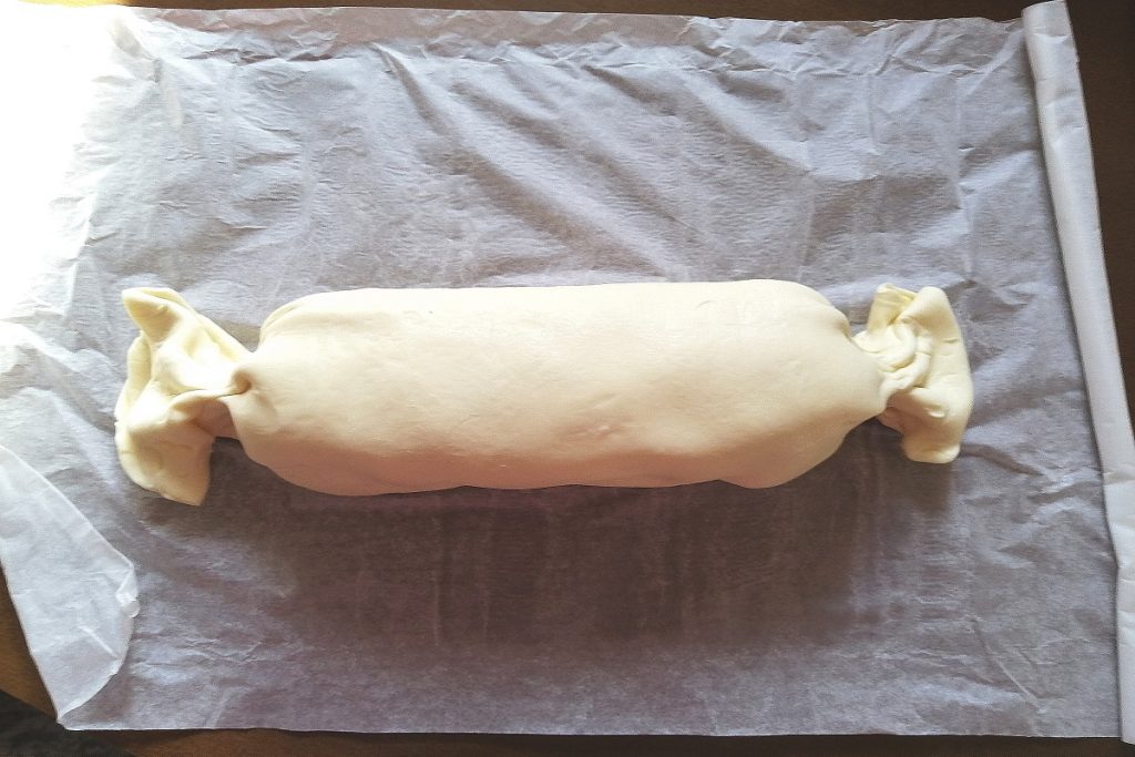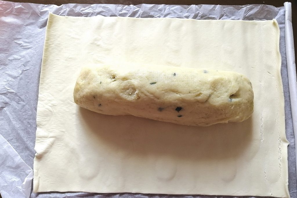 • Posicionamos o cotechino no centro da massa folhada e fechamos as duas laterais.