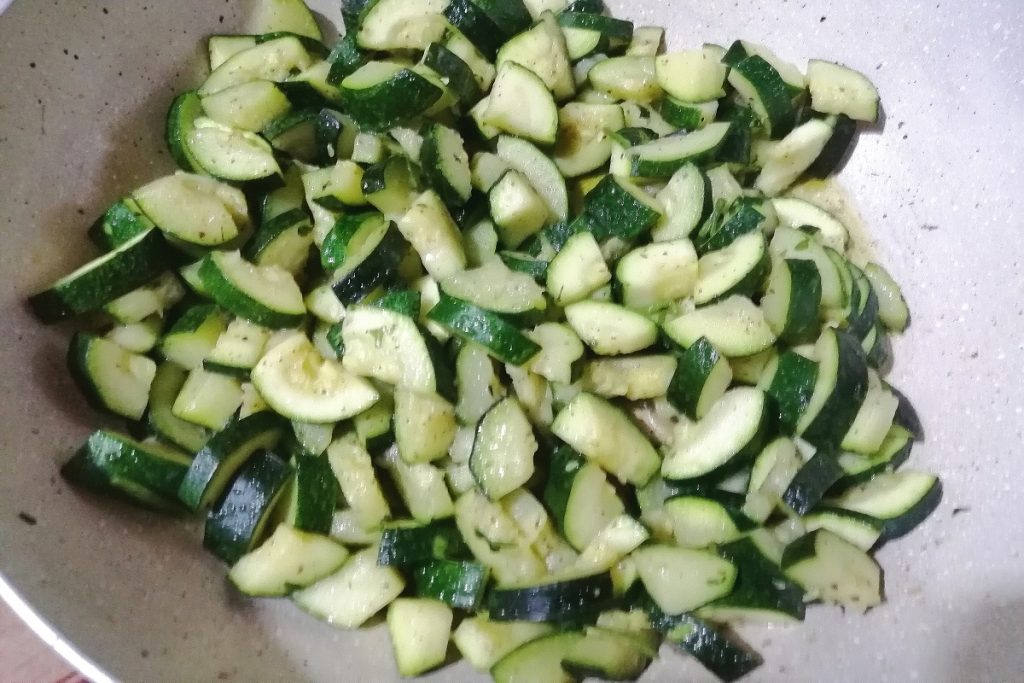 Colocamos as abobrinhas na panela e temperamos com sal, alho, salsa e hortelã.