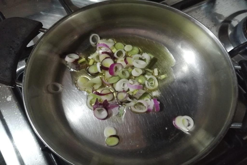 Em uma panela grande, colocamos as 2 colheres de azeite EVO, incorporamos a cebolinha e deixamos murchar suavemente.