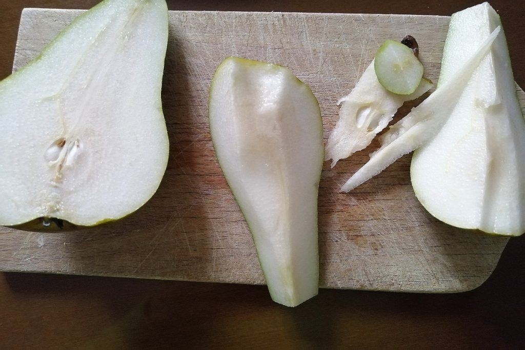 • Lave a pera e corte-a primeiro ao meio, depois em 4/4, remova a parte interna de sementes e pericarpo e corte em fatias finas.