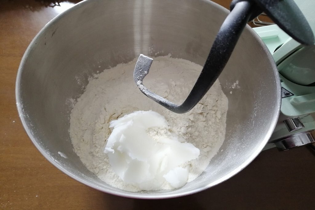 Coloque as farinhas misturadas e a banha amolecida no recipiente da batedeira planetária e com o gancho deixe trabalhar em velocidade média por alguns minutos.